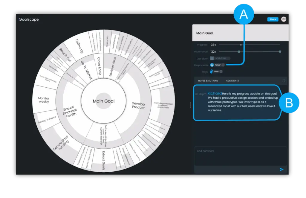 However, even the most beautiful goal tracker isn’t enough to keep teams aligned if they only look at it once a week. So we transformed Goalscape into a** goal-focused project communication tool**. Specifically, you can use Goalscape for direct communication by:
