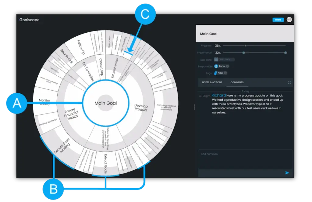 - The progress and priority of each goal : To-do lists are either checked or unchecked, and it is hard to assess how much each contributes to the Main Goal. In Goalscape you can immediately see each goal’s relative importance (the size of its slice) and its precise status (darker shading). Progress is set on the bottom-level tasks (because that’s where the action happens), using a slider (0% - 100%).