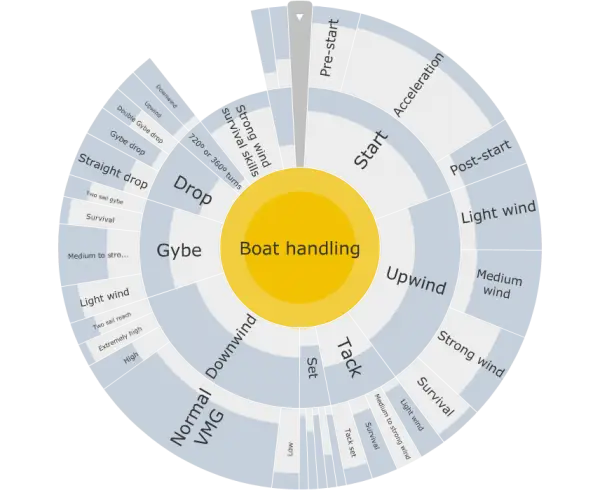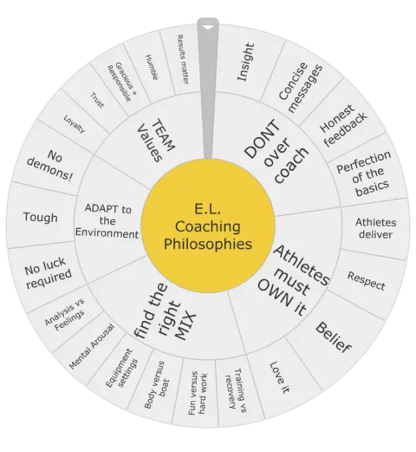 All'inizio del 2009 Nathan ha fatto coppia con Iain. Per i 3 anni e mezzo successivi, ogni nostro piano, azione e pensiero è stato valutato nel contesto di Londra 2012. È qui che Goalscape è venuto in mio personale soccorso. In primo luogo, Goalscape mi permette di definire filosofie e strategie chiare e semplici, che mi consentono di restare concentrato e di fare tutte le cose importanti. In secondo luogo, tutto ciò che di rilevante devo sapere o fare è conservato dentro una goalscape. Tutto, in ogni area in cui dobbiamo eccellere. Il sovraccarico di informazioni è un grosso problema in questo lavoro. Goalscape mi aiuta a tenerlo sotto controllo: è il mio indice visivo per conoscenze, dati, storia e gli ingredienti essenziali legati alla performance. Non posso mostrarti un esempio reale delle nostre goalscape di strategia di campagna, perché sono private e costituiscono proprietà intellettuale di valore. In sostituzione, ecco un esempio di goalscape per padroneggiare l'arte della vela che uso quando devo prendere decisioni difficili. Nelle prossime settimane pubblicherò un post di approfondimento che illustra il processo semplice per creare una goalscape di strategia sportiva.
