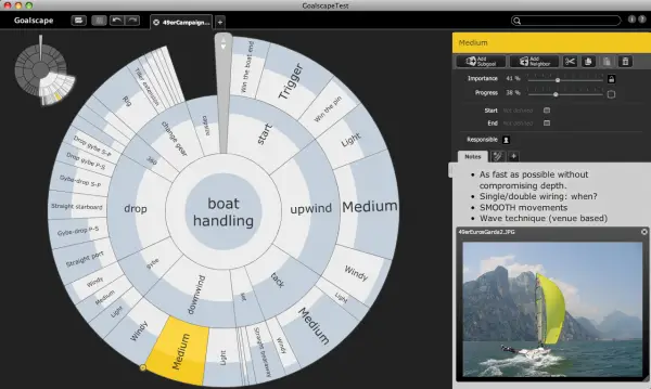 In effetti abbiamo guidato la regata olimpica fino alla 6ª prova, quando abbiamo iniziato a cedere a una delle nostre debolezze (non ti dirò quale!). Alla fine abbiamo chiuso al 5° posto, un risultato rispettabile – ma non era ciò a cui puntavamo. Anche nella sconfitta, però, Goalscape ci ha aiutato molto quando abbiamo analizzato cosa non aveva funzionato. Ha chiarito come, nelle condizioni del momento, una debolezza ne avesse portata un'altra. Dopo quell'esperienza ero certo che il concetto di Goalscape avesse bisogno di un'implementazione software per raggiungere il suo pieno potenziale. Disegnare le goalscape a mano era lento e noioso: non riusciva a gestire una sfida in continua evoluzione e con priorità che cambiavano rapidamente. Inoltre avevo già molte informazioni dettagliate in formati diversi (come appunti e diari, fogli di calcolo, persino file video) a cui dovevo accedere per obiettivi differenti. Così l'idea di Goalscape come strumento software visivo è cresciuta nella mia mente. Presto sono stato altrettanto determinato a crearlo quanto lo ero stato ad imparare il 49er. Fortunatamente sono riuscito a mettere insieme un ottimo team internazionale per seguirmi nel progetto. Progettare un software solido, utile, semplice e bello si è rivelato difficile quanto gareggiare alle Olimpiadi. Dopo molto lavoro (e un paio di false partenze!) abbiamo lanciato la nostra prima versione pubblica di Goalscape alla fine del 2009. Oggi è una soluzione di visualizzazione completa e matura: ecco come si presenta oggi la scomposizione della conduzione della barca: