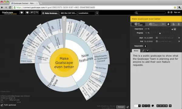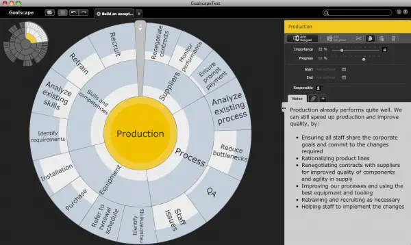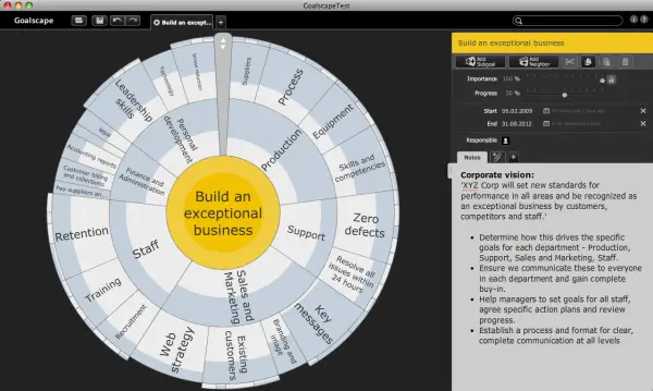 Goalscape mostra chiaramente quando la qualità dell'obiettivo al centro è poco sviluppata, incompleta o mal formulata. La maggior parte degli sportivi di successo è eccezionalmente motivata. Ha un obiettivo chiaro, sempre al centro dell'attenzione. Nel business i livelli medi di motivazione sono molto più bassi. La ragione principale è una mancanza di allineamento tra obiettivi personali e aziendali o l'assenza totale di un obiettivo visionario chiaro e ben comunicato. Goalscape è un ottimo modo per stabilire e mantenere un dialogo serio sugli obiettivi all'interno di un'organizzazione. Supporta una comunicazione completa, dall'alto verso il basso e dal basso verso l'alto, così tutti possono comprendere, adottare e influenzare lo sviluppo degli obiettivi e delle strategie aziendali. Con la nostra nuova versione web Goalscape Connect (attualmente disponibile in anteprima), diventa uno strumento imbattibile per una collaborazione online veloce e agile.
